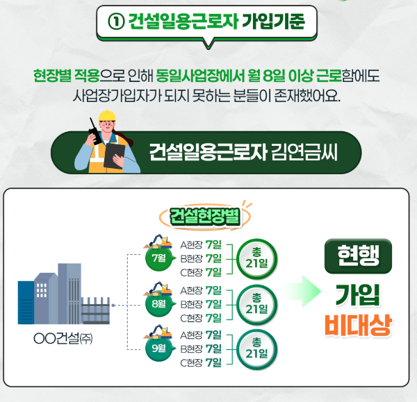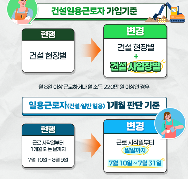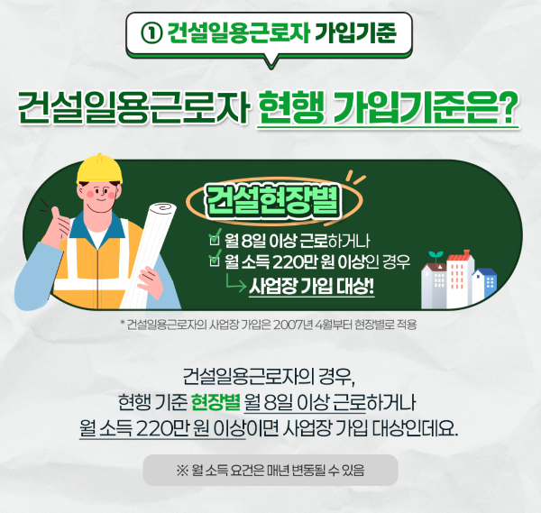 - 기존: 건설현장별로 월 8일 이상 또는 월 소득 220만 원 이상 시 가입