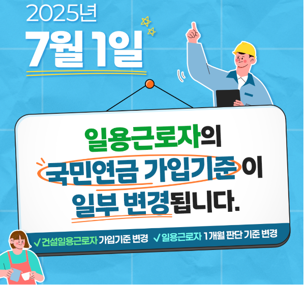 2025년 7월부터 건설 일용직 국민연금 제도가 바뀝니다. 그동안 국민연금 가입 조건이 까다로워 사각지대에 놓였던 많은 건설 일용근로자들이 이제는 더 쉽게 연금에 가입할 수 있게 됩니다. 이번 개편으로 어떤 점이 달라지는지, 어떤 혜택이 생기는지를 자세히 알아보겠습니다.