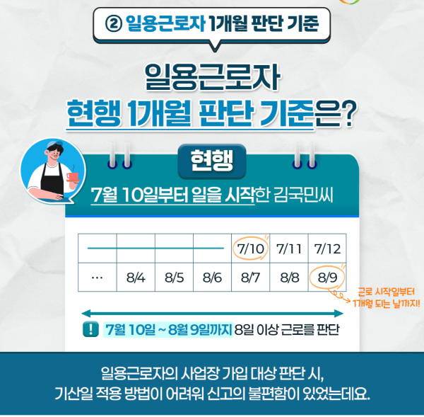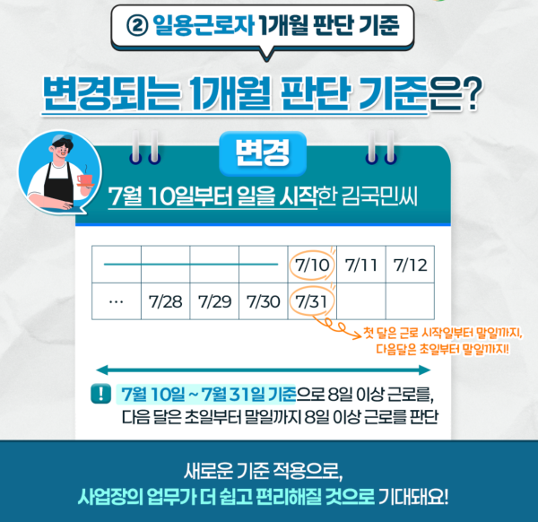 기존에는 고용일로부터 민법상 1개월을 기준으로 삼았습니다. 7월 10일에 근로를 시작하면 8월 9일이 되어야 1개월 고용으로 인정됐습니다. 하지만 개편 이후에는 해당 월의 말일을 기준으로 하기로 했습니다.